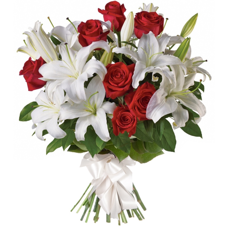 Букет состоит из 7 красных роз, 4 ветки белой лилии, прозрачная упаковка, атласная лента.