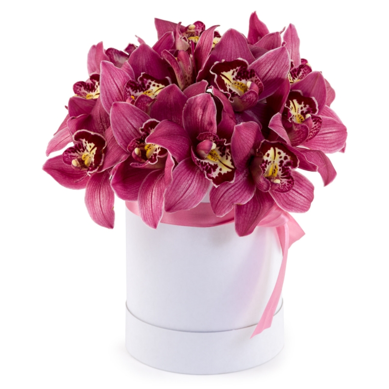 Букет состоит из 17 орхидей, коробка, оазис, атласная лента.